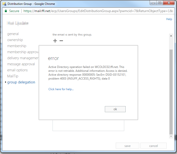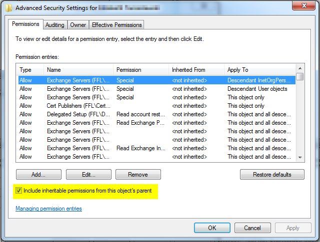 To bypass this error and add the user to the Send As list, go into the properties of the user in Active Directory. In the Security* tab, click "Advanced" and check the box that says "Include inheritable permissions from this object's parent." Click Apply and OK.