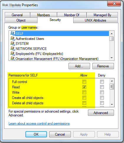 (*If you do not have a "Security" tab, go to the main Active Directory window, View menu --> Advanced Features.)
