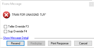 There might also be an occasion where two tellers are using different teller numbers, but their workstations are sharing the same Cleartouch license. This will also cause a conflict and balancing problems. The user might encounter a message in Cleartouch stating "Tran for Unasgnd Tlr" as shown below.