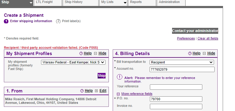If you receive an error message (such as the one below: "Recipient/third party account validation failed") when attempting to use one of these account numbers, contact Michelle Booker to report the issue.