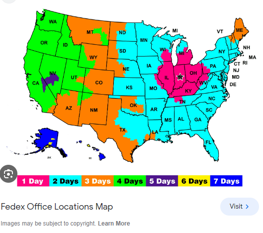 If a manager requests "overnight" shipping, generally you should still choose the standard FedEx Ground shipping option. This map can give you a general idea of the region covered for standard Ground shipping - if it is within the area, the package should still arrive within one day:
