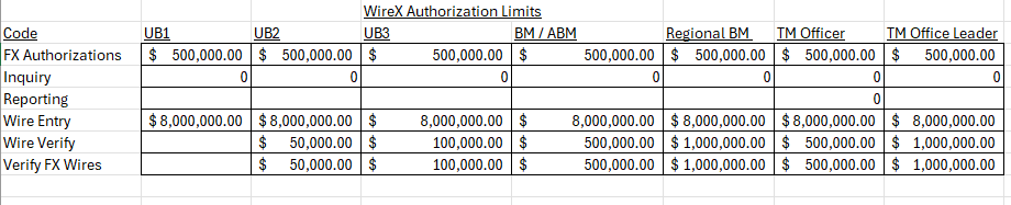 • Branch managers do not need to go through Teller Training prerequisite for WireXChange access.  Universal Bankers do need to wait; we get the OK from the Retail Trainer (Melinda Fellenstein) to set them up.