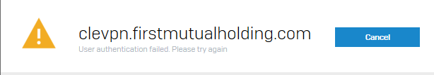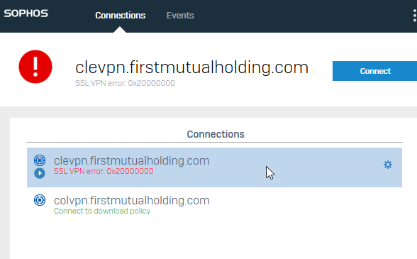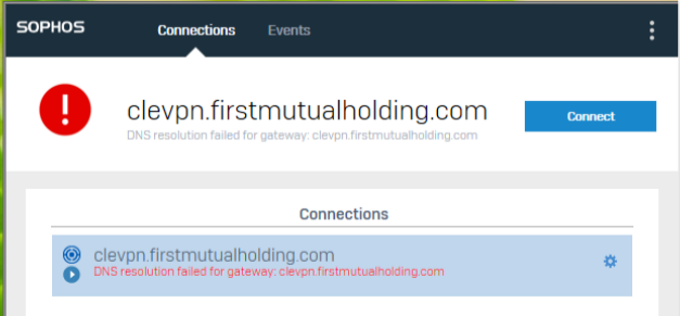 - If the user is receiving a Connection Failed message, ensure that they are connecting to the correct .PRO connection file (clevpn.firstmutualholding.com as of June 2021 - the old one starting with "FMHC" should not be used).