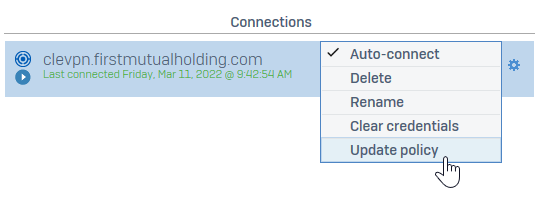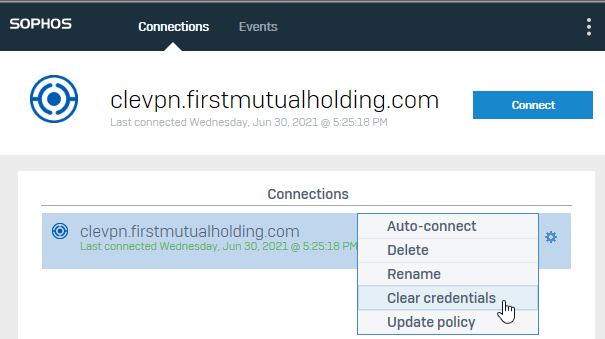 - In Sophos Connect, if the user has entered bad credentials AND clicked the "Save credentials" checkbox, they can (while disconnected from the VPN) click the gear icon in the row of the connection profile --> Clear credentials, then Connect and re-enter their username/password.
