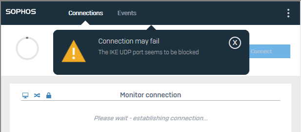 - If they receive an error that states "UDP/UDK/IKE blocked/failed" in Sophos Connect, they are more than likely locked out in AD.  "Connection may fail / The IKE UDP port seems to be blocked" = restart or reinstall the client
