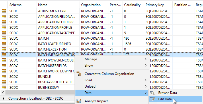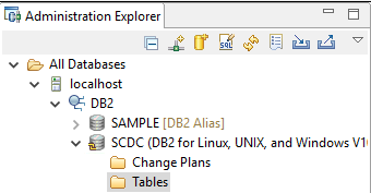 2. Navigate to localhost --> DB2 --> SCDC (right-click and Connect as db2admin account - pwd stored in KeePass) --> Tables