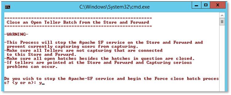 - You will see a warning screen in order to continue with the script. This will stop the Apache SF service so you don’t want any tellers to be scanning at this time.