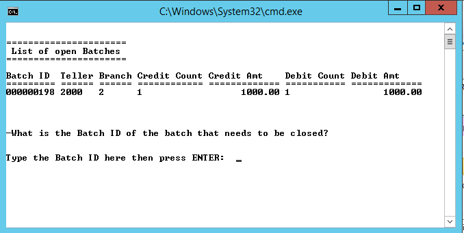 - Once it stops the Apache-SF service, it will connect to the database and list all open batches and the AuxBatchID or Teller ID tied to those batches. Make sure you know this information beforehand so you know exactly what batch to close (find the AuxBatchID in the "Batch" table). When entering the Batch ID, include the leading 0s so the whole batch ID is 9 Digits long. Since we can have duplicate batch IDs, you will then have to enter the Teller Number or AuxBatchID for this batch.