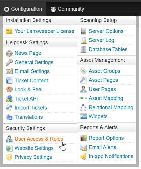 In Lansweeper, go to the Configuration tab --> User Access & Roles under Security Settings.