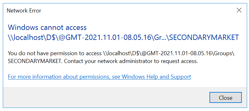 When attempting to look at Previous Versions of files on the G:/ drive on Earth, for example, you may encounter an error like this one: