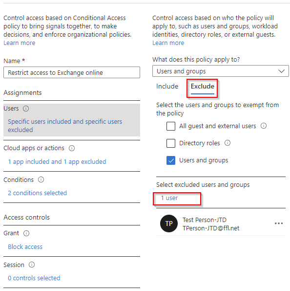 - Under the Exclude section, click the blue link that shows the current number of excluded users and add the desired user