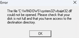 If you encounter the following error about vbajet32.dll during installation on a Windows 11 computer, simply run the installer in Windows 7 compatibility mode.