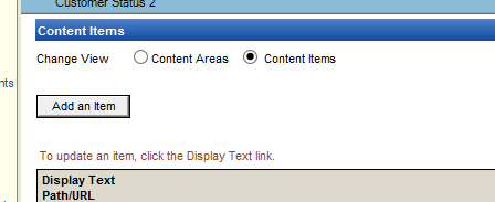 - If you need to change the name of a document or its link on the CTHP, change the radio button at the top to Content Items, scroll down to find the appropriate item, click on it, update its name and/or link, then click Submit