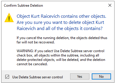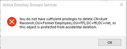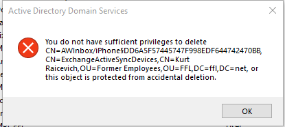 Occasionally, when deleting a former employee in Active Directory after they have been gone for six months, you may encounter messages like these: