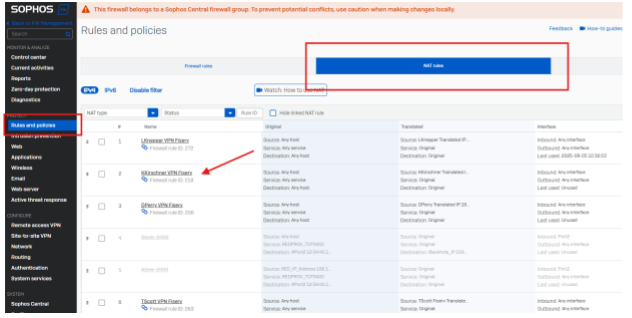 A hybrid or remote employee will need a NAT rule set up on the Sophos firewall in order to communicate with Fiserv and log into Cleartouch. (Branch staff with desktop computers do not need Sophos NAT rules.) To confirm if a user already has a NAT rule established, follow the steps below.