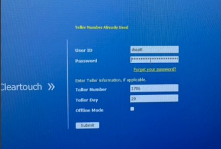 This is relatively rare to see, but can happen when an employee attempts to log into Cleartouch with the same teller number that another employee used on that same computer in the same business day.