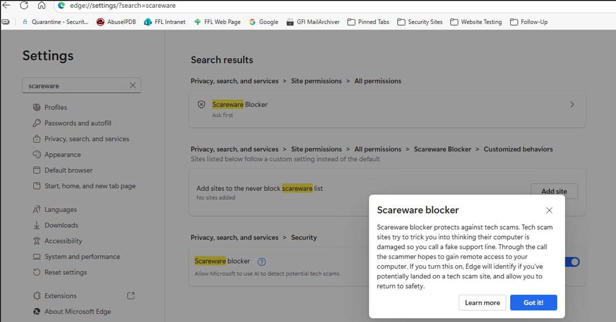 While this is a good thing for most people, it is compute intensive and I am assuming that we all know enough not be deceived by a pop-up like that. If you do not want this feature, which is enabled by default, you can disable it by just going to settings in Chrome or Edge, searching for “scareware” and disable it using the toggle switch. While this should not impact performance for most employees, this is something more to be aware of in case anyone does notice browser performance issues. It only runs on machines with at least 2 GB or RAM and 4 CPU cores, which all of our machines should have. It also does not run in browser private windows.